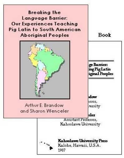 Brandow, A.E., & Wenceler, S. (1987). Breaking the language barrier: Our experiences teaching Pig Latin to South American aboriginal peoples (Rev. ed.). Kalohe, HT: Kahoolawe University Press.