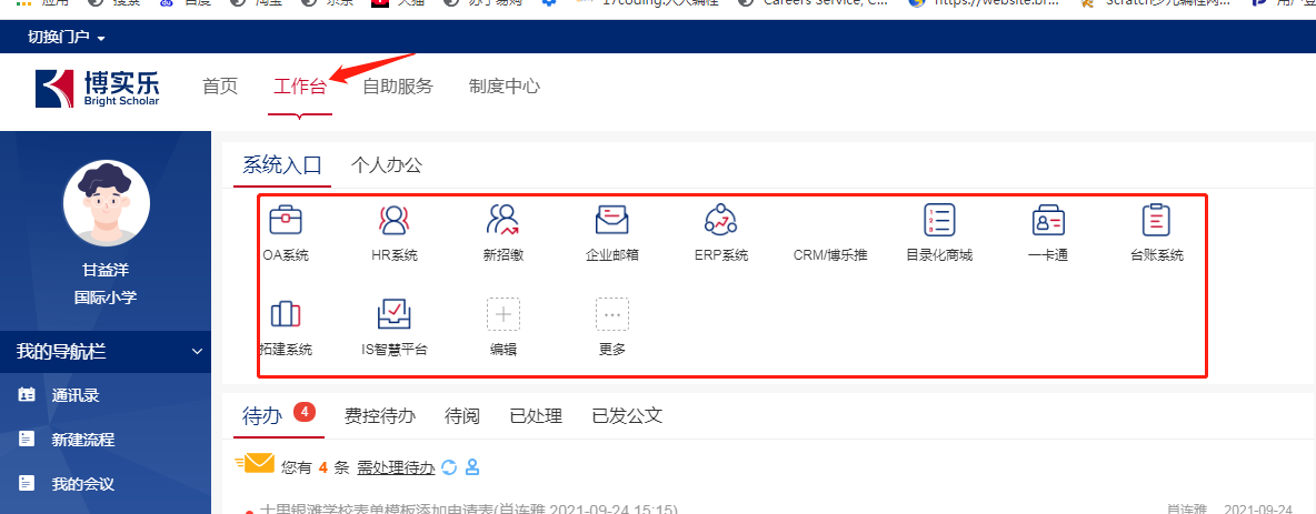 3、登录后,点击工作台,选择您需要进入的系统;